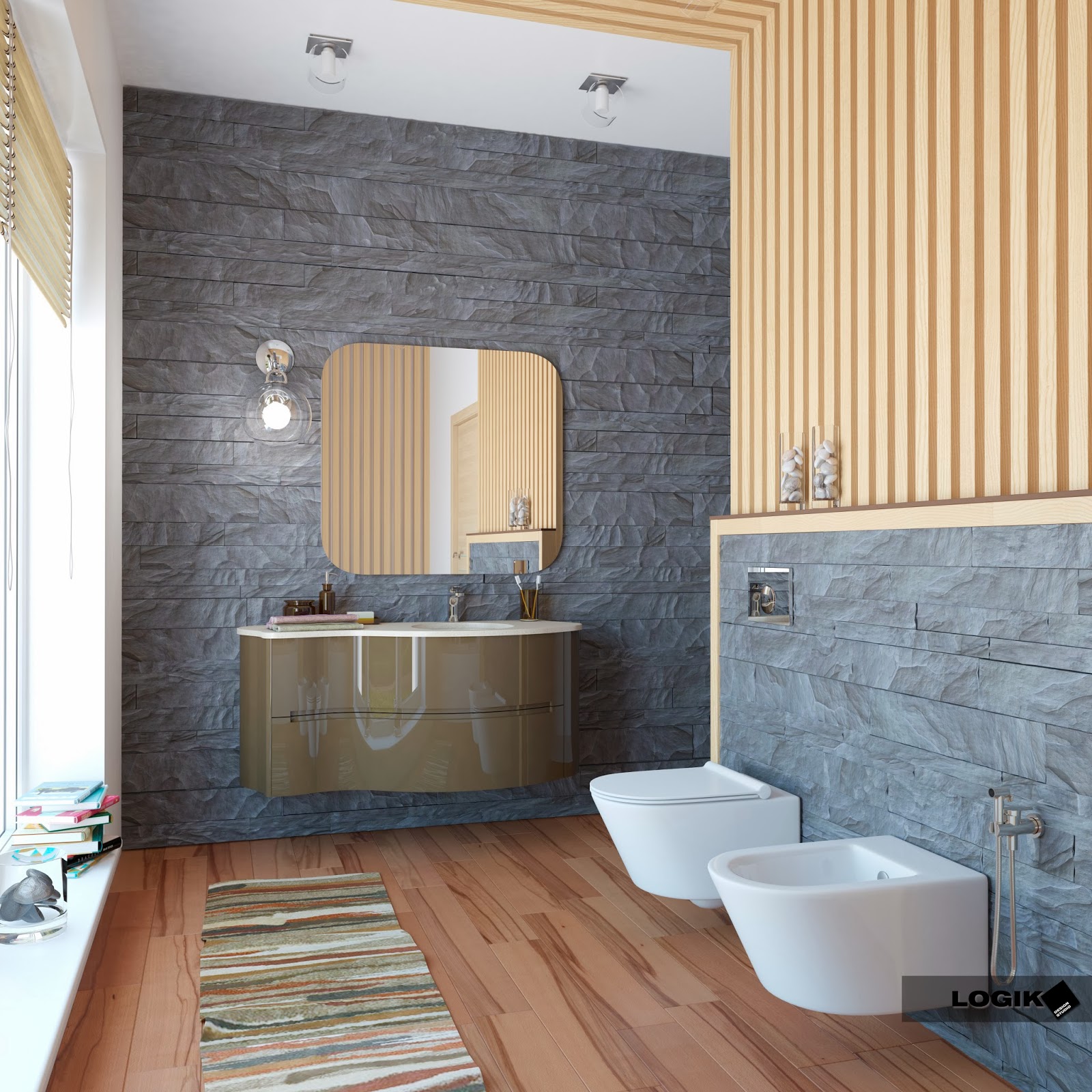 В данном интерьере гармонично переплетаются цвета серого грубого камня, светлого дерева, фактурной доски, белой керамики и оливкового цвета мебели.